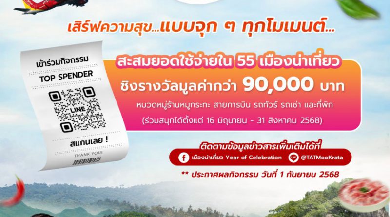 ทั้งนี้ ททท. คาดว่าแคมเปญดังกล่าวจะมีส่วนสำคัญในการสร้างบรรยากาศการท่องเที่ยวช่วงฤดูฝนให้คึกคัก พร้อมกระตุ้นการใช้จ่ายในชุมชน สร้างรายได้หมุนเวียนสู่ท้องถิ่นไม่น้อยกว่า 140 ล้านบาท และช่วยเสริมภาพลักษณ์ของเมืองท่องเที่ยวในฐานะจุดหมายปลายทางใหม่ที่น่าค้นหาอย่างยั่งยืน และนักท่องเที่ยวยังสามารถร่วมสนุกกับกิจกรรม Top Spender ผ่าน Line Officail : @TATMooKrata เพื่อสะสมยอดใช้จ่ายจากร้านหมูกระทะ สายการบิน รถทัวร์ รถเช่าและโรงแรมที่พักใน 55 จังหวัดเมืองน่าเที่ยว เพื่อลุ้นเป็นผู้มียอดสะสมสูงสุด 45 อันดับแรก รับของรางวัลจากทางแคมเปญ รวมมูลค่ากว่า 90,000 บาท