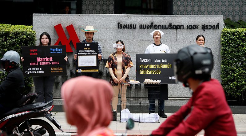 กรุงเทพฯ: 29 กันยายน 2568 – นักรณรงค์จากซิเนอร์เจีย แอนนิมอล (Sinergia Animal) ตั้งแต่กรุงเทพฯ จนถึงรีโอเดจาเนโร จัดกิจกรรมร่วมกันทั่วโลกเรียกร้องและผลักดันให้เครือโรงแรมแมริออทเร่งดำเนินงานตามคำมั่นสัญญาในการใช้ไข่ไก่ปลอดกรง (Cage-Free) 100% ภายในปี 2568 ซึ่งเป็นส่วนหนึ่งของนโยบายด้านความยั่งยืนที่ประกาศไว้ตั้งแต่ปี 2561 แม้ความก้าวหน้าในระดับโลกเป็นที่น่าชื่นชม แต่ยังต้องมุ่งเน้นการดำเนินงานอย่างเต็มที่ในภูมิภาคเอเชียซึ่งเหลือเวลาเพียง 3 เดือนสุดท้าย