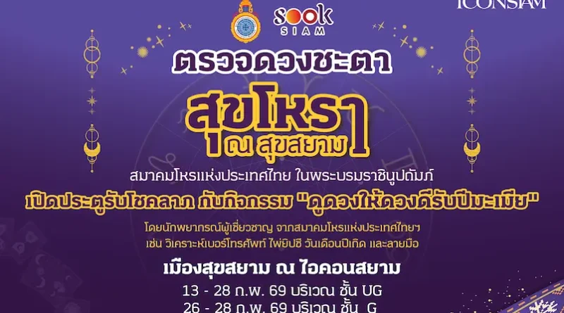 เมืองสุขสยาม ณ ไอคอนสยาม จัดกิจกรรมพิเศษต้อนรับเทศกาลตรุษจีนปีมะเมีย ภายใต้ชื่อ “สุขโหรา ณ สุขสยาม” เปิดประตูรับโชคลาภ เสริมสิริมงคลต้อนรับปีใหม่จีน ชวนสายมูและผู้ที่สนใจศาสตร์พยากรณ์ร่วมกิจกรรม “ดูดวงให้ดวงดีรับปีมะเมีย” โดยทีมนักพยากรณ์ผู้เชี่ยวชาญจาก สมาคมโหรแห่งประเทศไทย ในพระบรมราชินูปถัมภ์ ที่จะมาร่วมให้คำปรึกษาอย่างใกล้ชิด ครอบคลุมทุกมิติชีวิต ทั้งโชคลาภ การงาน การเงิน ความรัก สุขภาพ พร้อมเช็กดวงปีชงแบบละเอียดครบทุกศาสตร์