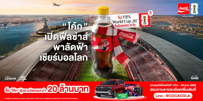 กรุงเทพฯ 18 มีนาคม 2569 – ซัมเมอร์นี้จะซ่าและตื่นเต้นกว่าที่เคย เมื่อ กลุ่มธุรกิจโคคา-โคล่า ในประเทศไทย อันประกอบไปด้วย บริษัท ไทยน้ำทิพย์ คอร์ปอเรชั่น จำกัด (มหาชน) บริษัท หาดทิพย์ จำกัด (มหาชน) และบริษัท โคคา-โคล่า (ประเทศไทย) จำกัด เสิร์ฟโปรโมชั่นสุดยิ่งใหญ่รับหน้าร้อนกับแคมเปญ “โค้ก” เปิดฟีลซ่าส์ พาลัดฟ้าเชียร์ FIFA World Cup™ พร้อมสานฝันแฟนบอลชาวไทยให้กลายเป็นจริง ด้วยการมอบประสบการณ์ระดับเวิลด์คลาสแบบ “ครั้งหนึ่งในชีวิต” พาผู้โชคดีบินลัดฟ้าไปชมการแข่งขันฟุตบอลโลก FIFA World Cup 2026™ ถึงมหานครนิวยอร์ก สหรัฐอเมริกา พร้อมจัดเต็มของรางวัล ทั้งส่วนลดรายวัน รางวัลประจำสัปดาห์ และรางวัลใหญ่ท้ายแคมเปญอย่างรถยนต์และอุปกรณ์เกมมิ่งระดับไฮเอนด์ รวมมูลค่ากว่า 20 ล้านบาท! ร่วมสนุกได้ตั้งแต่วันนี้จนถึงวันที่ 26 เมษายน 2569